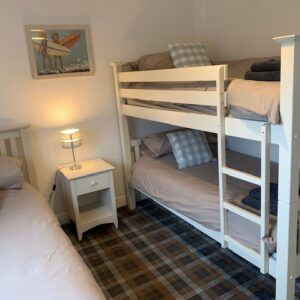 The house features: Entrance hall and cloakroom with downstairs WC. Lounge / Kitchen / Dining – a generous open plan lounge / kitchen / dining with a fully fitted contemporary style kitchen with all integrated appliances and dining area with spacious dining table and seating for 5 people. Bi-fold patio doors lead onto the furnished patio with outdoor seating surrounded by a large shared garden and landscaped grounds. The Master bedroom – A double bed, drawer unit and TV mounted on the wall as well as a beautiful balcony and sea view. The second bedroom – generous size wit bunks and a single bed, wardrobe and side table. The bathroom is a family bathroom with a shower over bath, cabinet, WC and heated towel rail – ideal for drying your clothes after a day at the pool or beach. Our house offers a easy access to the entrance which is ideal for prams/pushchairs. We supply a cot and highchair free of charge. For a small fee we will welcome well behaved dogs (2 max).