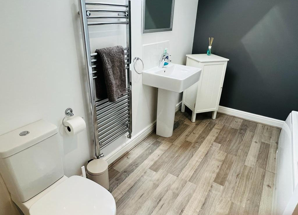 The house features: Entrance hall and cloakroom with luxury downstairs WC. Lounge / Kitchen / Dining – a generous open plan lounge / kitchen / dining with a fully fitted contemporary style kitchen with all integrated appliances and dining area with spacious dining table and seating for 6 people. Double patio doors lead onto the furnished patio with outdoor seating and a brick built barbeque surrounded by a large shared garden and landscaped grounds.
