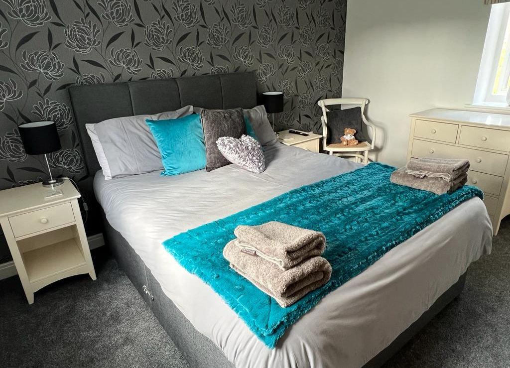 The house features: Entrance hall and cloakroom with luxury downstairs WC. Lounge / Kitchen / Dining – a generous open plan lounge / kitchen / dining with a fully fitted contemporary style kitchen with all integrated appliances and dining area with spacious dining table and seating for 6 people. Double patio doors lead onto the furnished patio with outdoor seating and a brick built barbeque surrounded by a large shared garden and landscaped grounds. Downstairs bedroom with super king bed- generous sized bedroom, wardrobe and side table. The Master bedroom – A king size bed, drawer unit and TV mounted on the wall as well as a large wardrobe and an ensuite shower and WC. Twin bedroom – generous sized twin bedroom, chest of drawers and side table. The bathroom is a family bathroom with a shower over bath, cabinet, WC and heated towel rail – ideal for drying your clothes after a day at the pool or beach. Our house offers a long wheelchair entrance ramp which is ideal for prams/pushchairs. We supply a cot and highchair free of charge. For a small fee we will welcome well behaved dogs (2 max) and even supply bowls for when they are thirsty after a long walk.